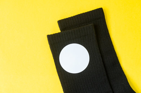 Black socks with a round sticker on a yellow table. Knitted product with a mock-up of the price tag, round white blank