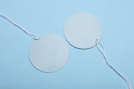 Round price tags on ropes, pastel background