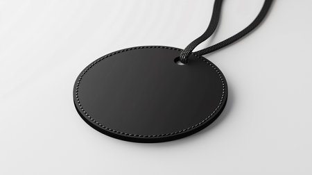 A minimalistic round black tag with a hole and string for hanging, suitable for labels, branding, or product identification.