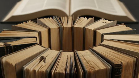 This image showcases a collection of aged, hardbound books arranged in a circular pattern with their pages opened. It evokes a sense of history, knowledge, and scholarly pursuits.