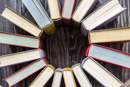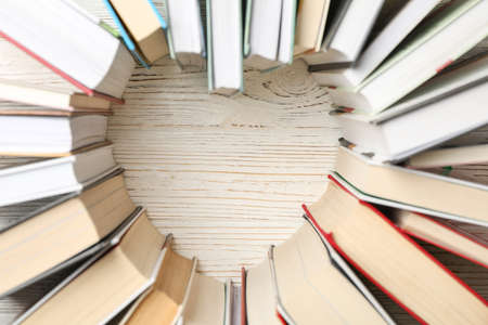 Different books on a wooden table. The concept of education and knowledge from books. Top view.