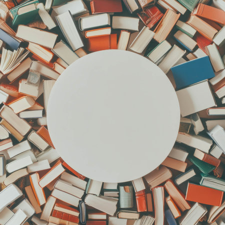 A captivating aerial perspective of numerous hardback books arranged in a circular pattern, radiating outward from an open book at the center, creating a dynamic composition. .