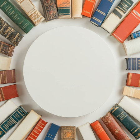 Minimalist white circular podium surrounded by colorful books for display and education themes