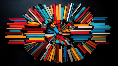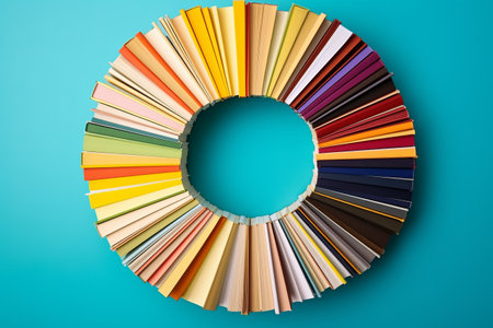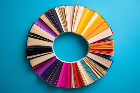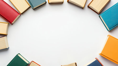 A vibrant arrangement of colorful books in a circular formation on a clean white surface. Perfect for themes of education, reading, and creativity.