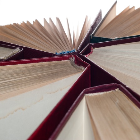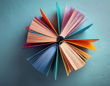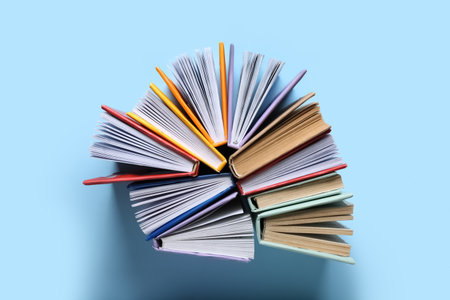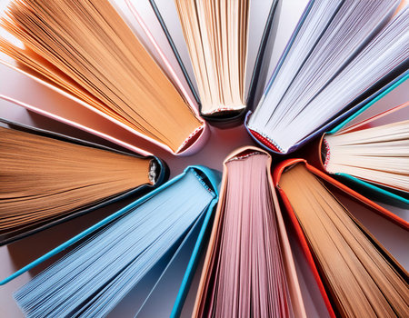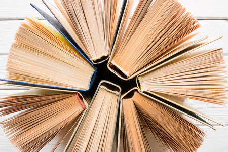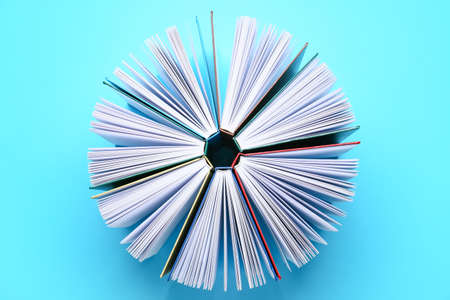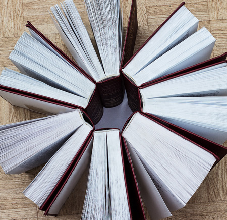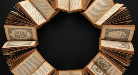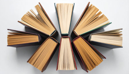 Open books arranged in a circular pattern on a plain background showcasing their pages