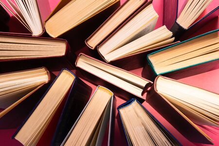 Сoncept of education, knowledge, wisdom. Group of hardcover books on a red table. Copy space. Flat lay