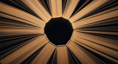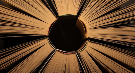 A collection of vintage, hardcover books stands open, their aged pages fanning out to form a perfect circle.