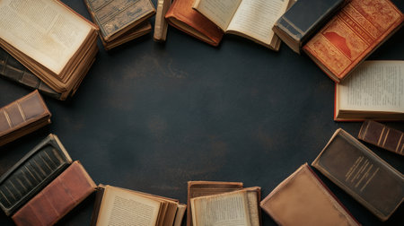 A collection of antique books arranged in a circular pattern on a dark, textured background. The aged covers and open pages evoke a sense of history, knowledge, and nostalgia.