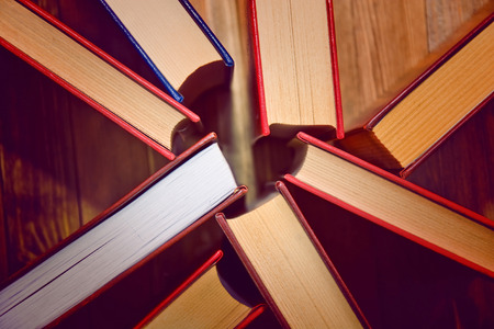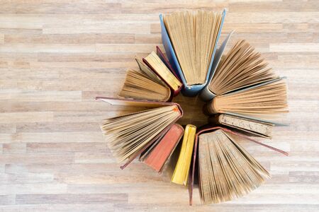 Old and used hardback books, text books seen from above on wooden floor. Books and reading are essential for self improvement, gaining knowledge and success in our careers, business and personal lives