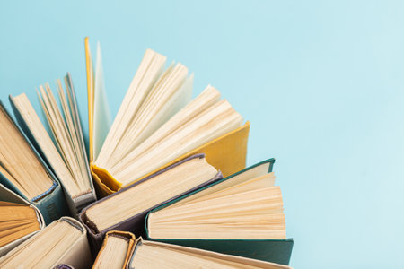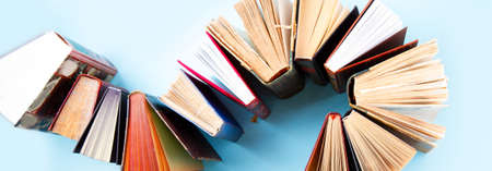 Old vintage books on blue background, top view. World Book Day poster. education concept.