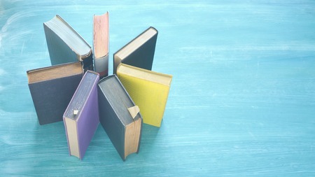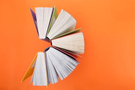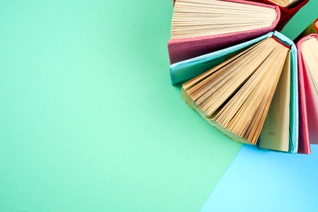 multicolored books, flat lay. Reading,literature,education,library,home office, back to school concept