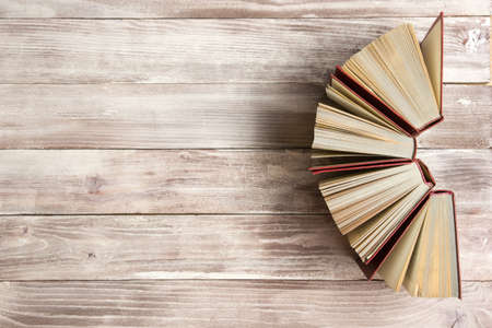 Open book, hardback books on wooden table. Education background. Back to school. Copy space for text