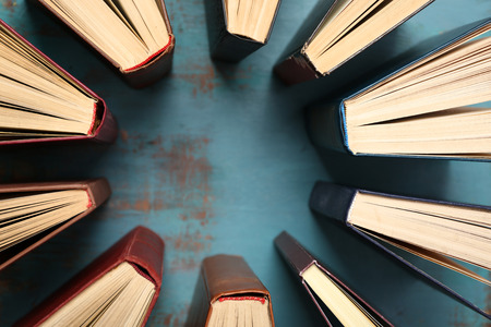 Books placed in a circular arrangement on a table, top view, symbolizing a community of knowledge