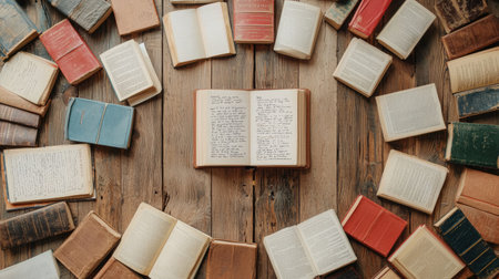 A beautiful arrangement of vintage books surrounding an open book on a rustic wooden surface. This composition captures the essence of literary exploration and nostalgia.