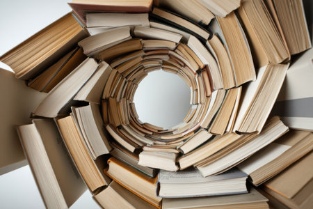 A captivating spiral of books invites viewers to explore the endless journey of knowledge accumulation.