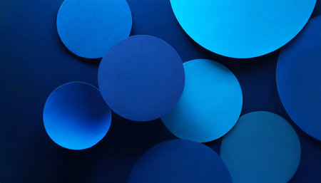 Abstract blue background with paper circles. Top view. Copy space.