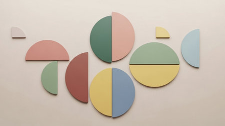 A collection of rounded geometric shapes in soft pastel colors, divided into two halves, artfully arranged against a plain backdrop.