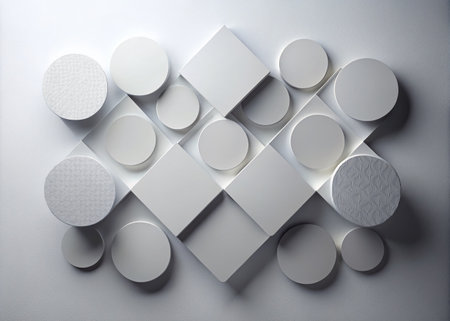 This captivating 3D render showcases a striking interplay of form and light. A collection of elegantly rendered gray circles and a prominent rhombus are presented against a pristine white backdrop. The low-light setting casts soft, subtle shadows that accentuate the three-dimensional nature of each shape, enhancing their textures and creating a visually rich composition. Delicate highlights subtly illuminate the surfaces, adding depth and intrigue to the design. The interplay of light and shadow produces a mesmerizing visual effect, drawing the viewer into the intricate details. This artistic piece is perfect for use in various design projects, from posters and digital art to interior design or product packaging. The subdued color palette and refined shapes suggest a sense of sophistication and modern aesthetic. The subtle variations in shading and texture create a dynamic visual interest, making this render a truly unique and compelling piece. The delicate balance of light and shadow, coupled with the clean lines, creates a visually arresting image, ideal for capturing attention and conveying a sophisticated message. Its elegance lies in the quiet power of the composition, where the shapes and light create a visual narrative.