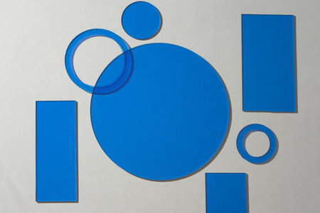 Flat lay, top view of blue geometric shapes on gray background. Space for display product.