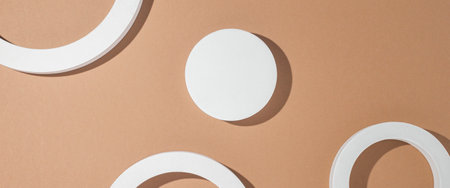White square geometric presentation podiums on brown background. Top view, flat lay. Banner.