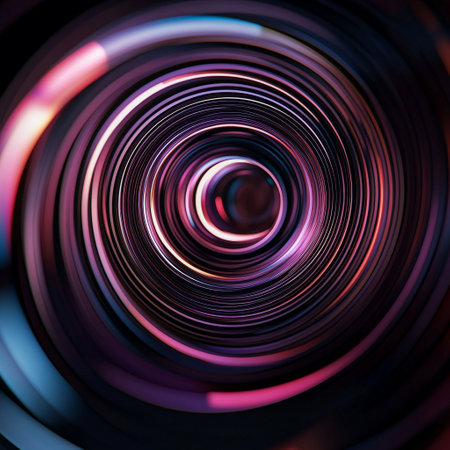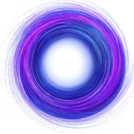 This abstract art piece features a vibrant circular design with dynamic blue and purple lines radiating towards a luminous center, embodying energy and movement in a digital space.