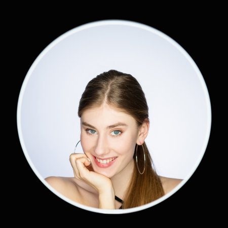 Smiling face. Positive emotion. Feminine beauty. Headshot portrait of happy shy woman with natural makeup isolated on neutral background in round avatar frame on black.