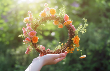 Hands uplift a beautiful wreath made of vibrant flowers and greenery. The background features lush foliage, creating a serene, natural ambiance in daylight.