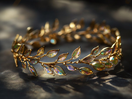 A decorative golden tiara with leaf designs and iridescent stones, set against a soft-focused shadowy background.
