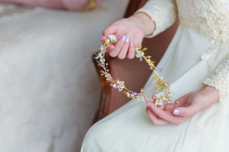 Close-up of bride's hands with hair ornament for wedding hairstyle.