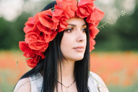 beautiful girl in wreath of flowers in meadow on sunny day. Portrait of Young beautiful woman wearing a wreath of wild flowers. Young pagan Slavic girl conduct ceremony on Midsummer. Earth Day