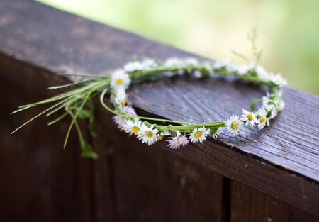 A wreath of wildflowers floats on the river against the backdrop of sunset and nature. Daisies and other wildflowers are woven into a wreath.