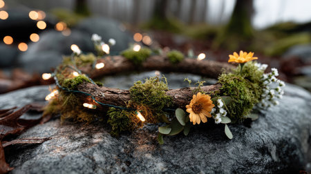 A beautifully crafted nature wreath made of moss and delicate flowers is adorned with fairy lights, resting on a stone in a tranquil forest setting.