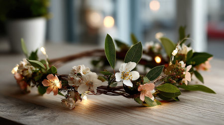 A stunning floral crown adorned with delicate flowers and soft lights, set on a rustic wooden surface, ideal for romantic decor and photography.
