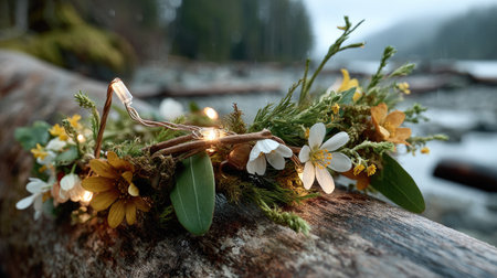 A captivating floral crown with delicate flowers and soft lights placed on a log by a serene river, creating a peaceful and enchanting natural scene.