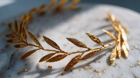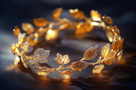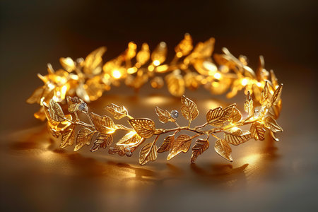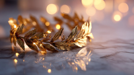 Golden laurel wreath on a mirror surface reflecting soft warm lighting, enhancing shine and dimension