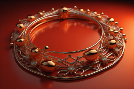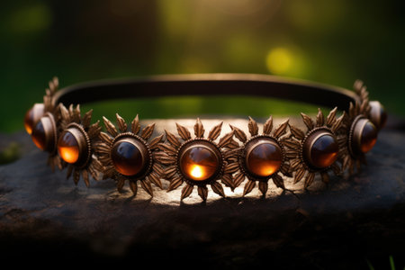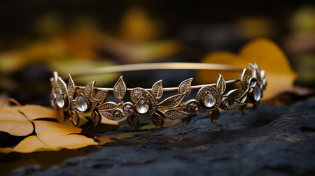 a gold crown, adorned with delicate flowers and surrounded by leaves, rests on the ground. the crown features goa-inspired motifs and sterling silver highlights, showcasing exquisite craftsmanship. this uhd image by dariusz zawadzki captures the beauty of the crown, while the bentwood adds a unique touch to the overall composition. ai generated