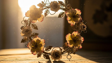 A delicate floral wreath made of metal and ceramic flowers with soft yellow and pink petals, illuminated by warm golden sunlight.