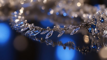 A stunning crystal necklace adorned with blue accents. The intricate design reflects light beautifully, creating an elegant atmosphere perfect for jewelry photography.