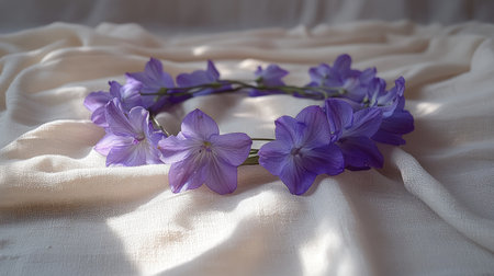Delicate wreath of blooming larkspur resting on textured canvas with natural shadows