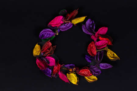 Multi-colored dry petals on a black background.