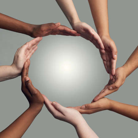 This captivating image showcases a harmonious arrangement of hands in various skin tones, forming a circle that represents togetherness and support. The hands, each unique yet collectively powerful, evoke a sense of community and shared purpose, inviting viewers to reflect on the strength found in diversity