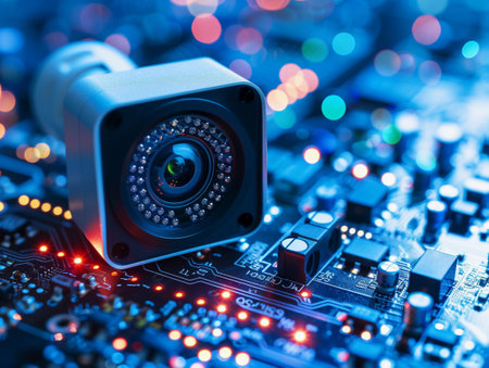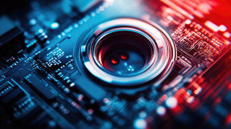 Security camera on a circuit board with glowing elements