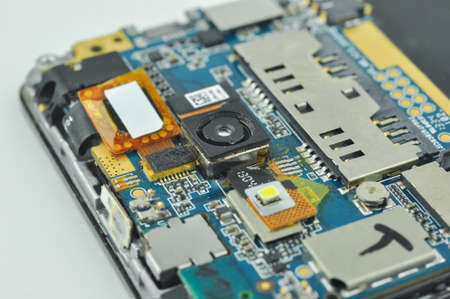 Disassembled mobile phone or smartphone. Circuit board, camera, microcircuit, slots for sim cards. Macro photo.