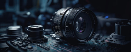 Camera lens on the motherboard close up. The concept of professional photography.