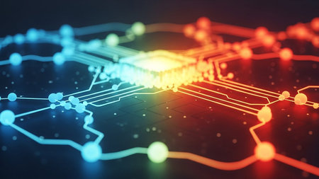An abstract close-up of a circuit board with glowing neon lines in blue, pink, and green against a dark background, representing technology and connectivity.