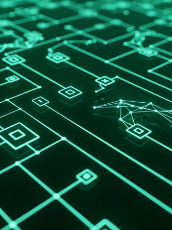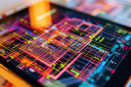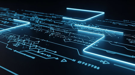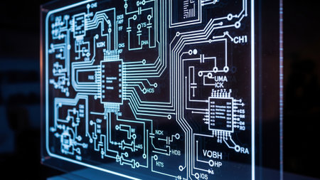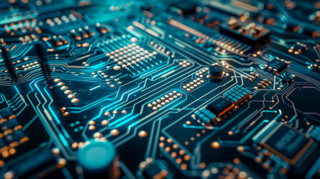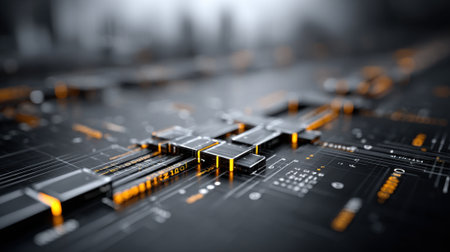 A close-up view of a sophisticated digital circuit board featuring intricate patterns and glowing orange elements. The scene captures the essence of technology and innovation.