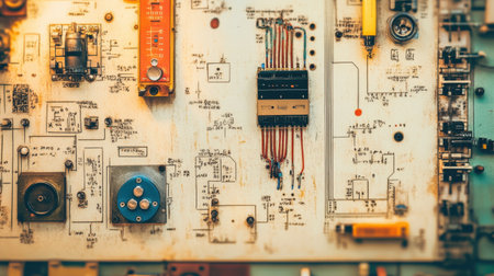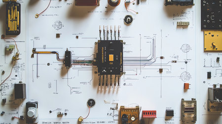 A detailed arrangement of electronic components over a circuit board layout. Ideal for projects involving technology design, prototyping, and electronic engineering.