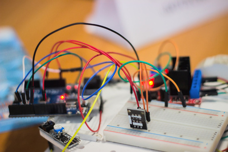 Electronic component and wired connected with breadboard on wood background. Modern technologies, electronics, DIY product engineering.