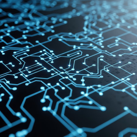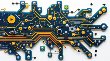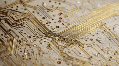 A striking abstract circuit board featuring intricate lines and metallic components against a dark background, evoking themes of technology and innovation.