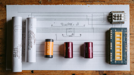 This image features a precise layout of various electronic components on a blueprint background, ideal for engineers, hobbyists, and DIY enthusiasts.